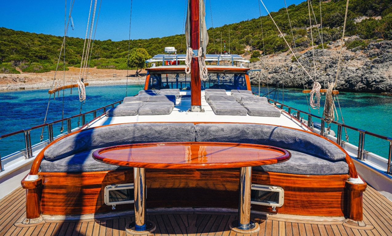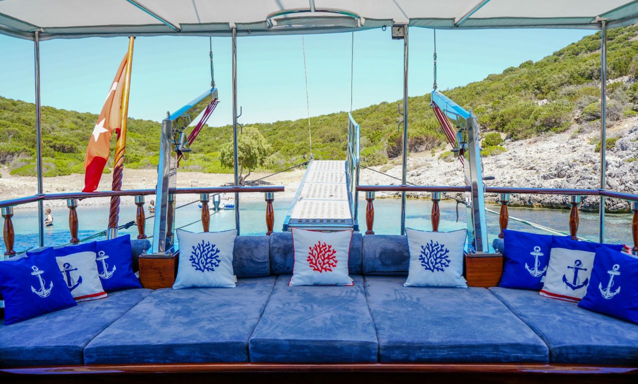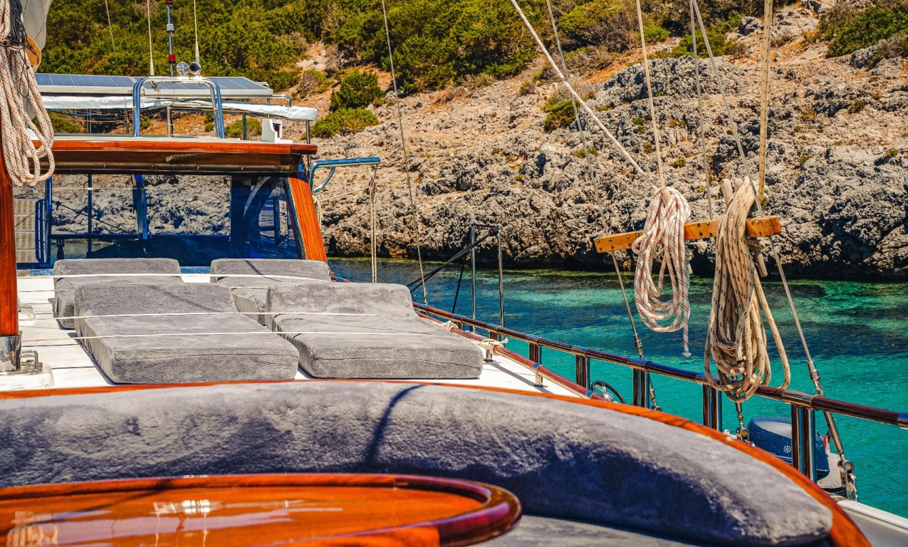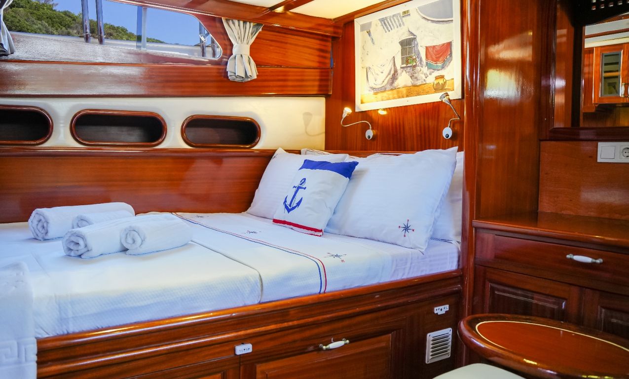 | Die Gulet Oalis ist eine 19 Meter lange traditionelle Holzyacht, gebaut 2011. Sie verfügt über eine Master- und zwei Doppelkabinen, jeweils mit eigenem Bad, und bietet Platz für bis zu sechs Gäste – perfekt für Familien oder kleine Gruppen. Das Deck wurde sorgfältig gestaltet und bietet gemütliche Sitz- und Essbereiche im Freien. Unter Deck befindet sich ein einladender Salon mit Essbereich und voll ausgestatteter Kombüse. Für Wassersport bietet Oalis ein Beiboot mit 25 PS Außenborder, ein Paddleboard, ein Kanu, Schnorchel- und Angelausrüstung. Angetrieben von zwei 280 PS Iveco-Motoren erreicht sie 9 Knoten. Ein 16 kVa Generator und 12V/24V/220V Stromversorgung sorgen für Komfort; Klimaanlage ist bis zu 5 Stunden täglich verfügbar. Die Gulet Oalis segelt entlang der Südwestküste der Türkei – ab Bodrum, Marmaris, Göcek oder Fethiye – und bringt Gäste in verborgene Buchten und türkisfarbene Gewässer. |