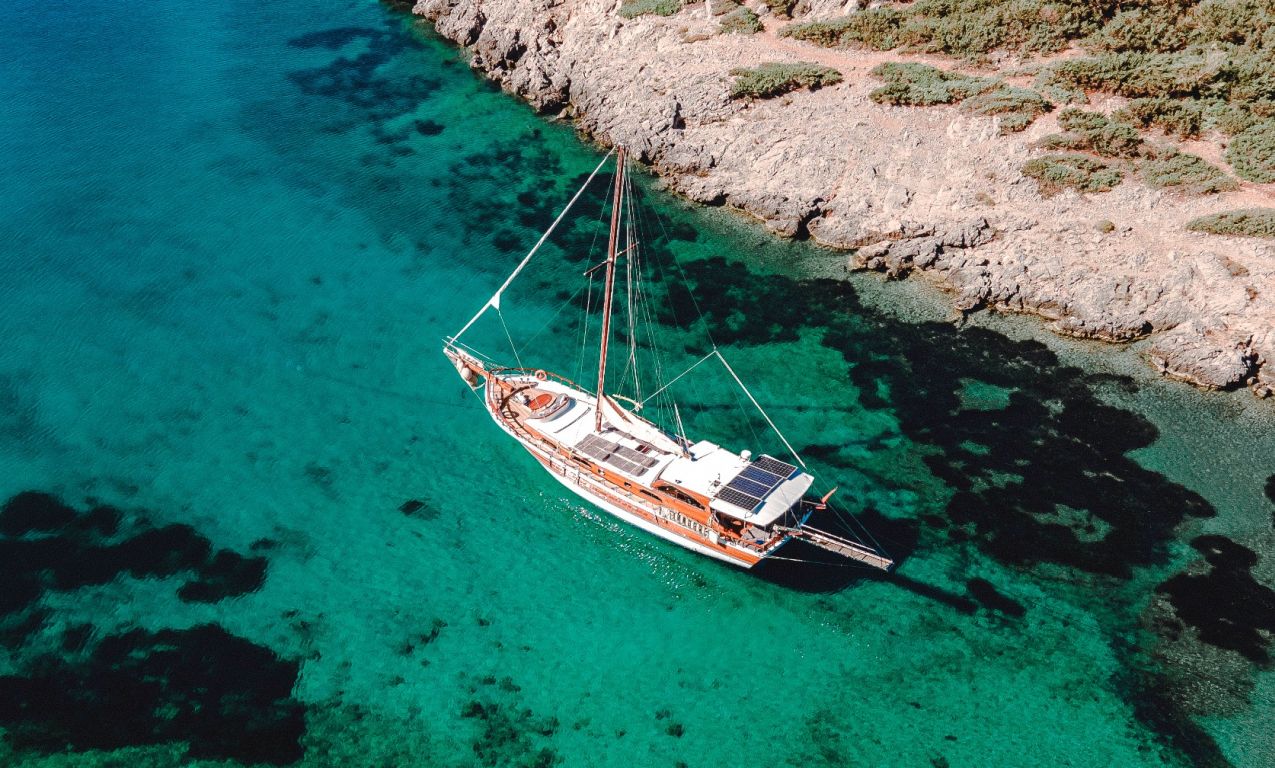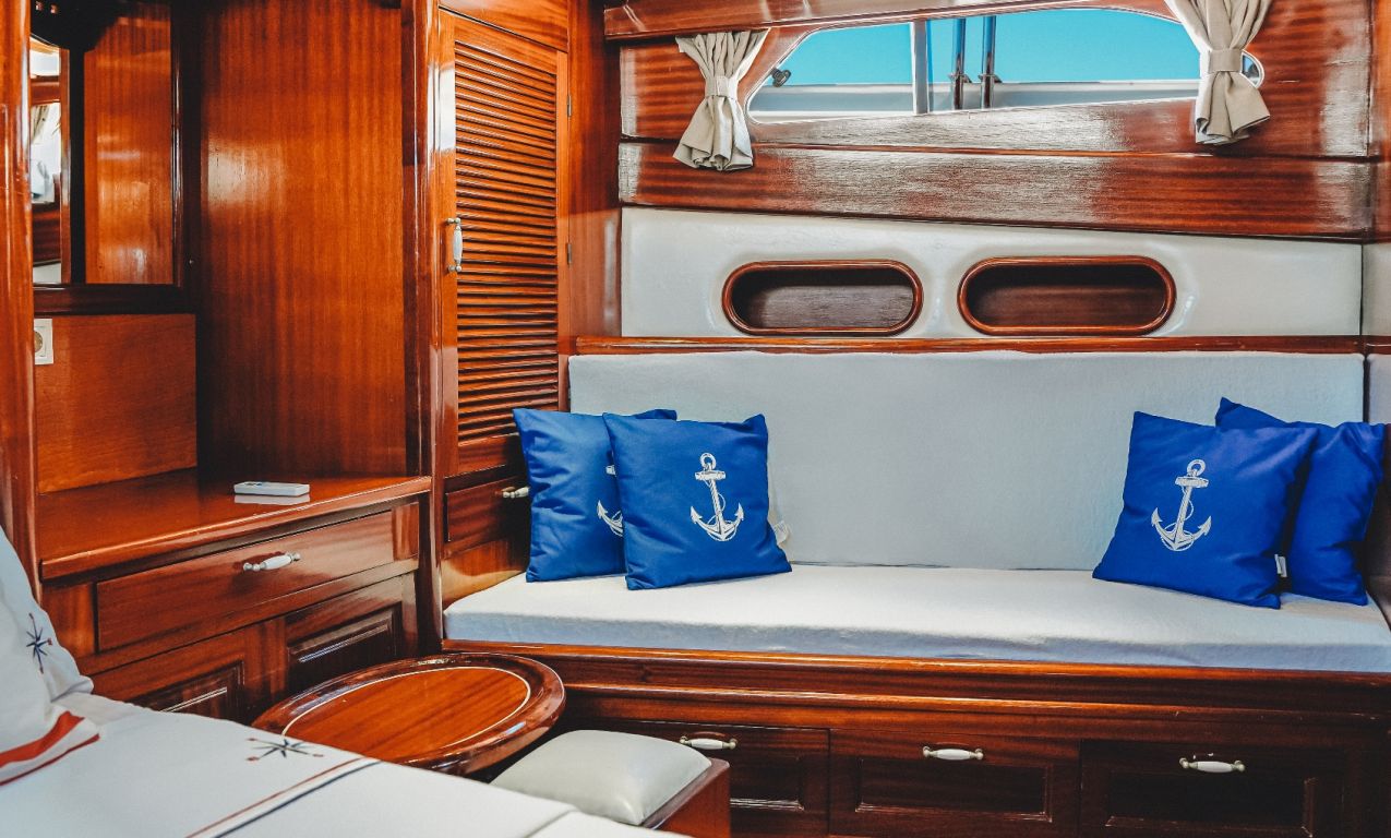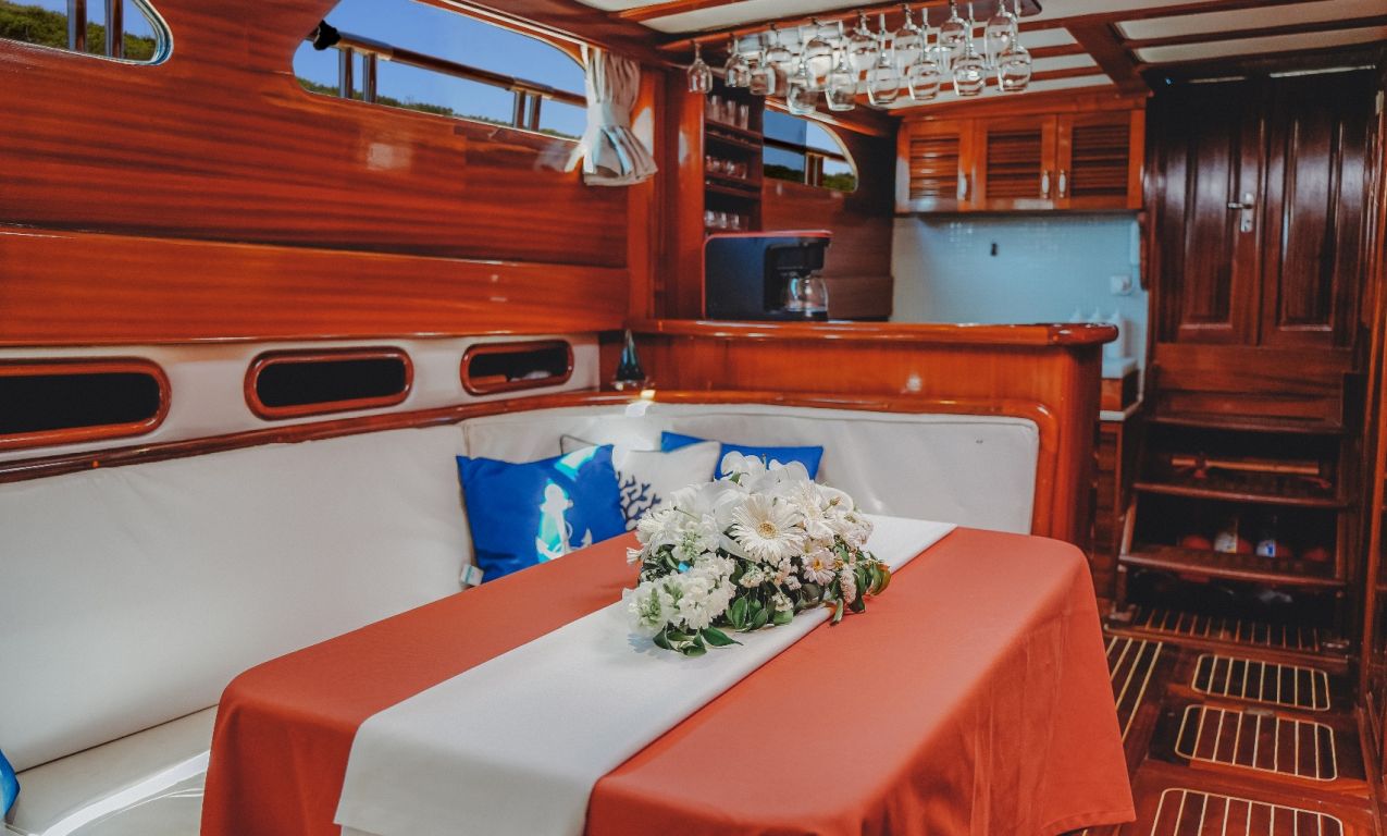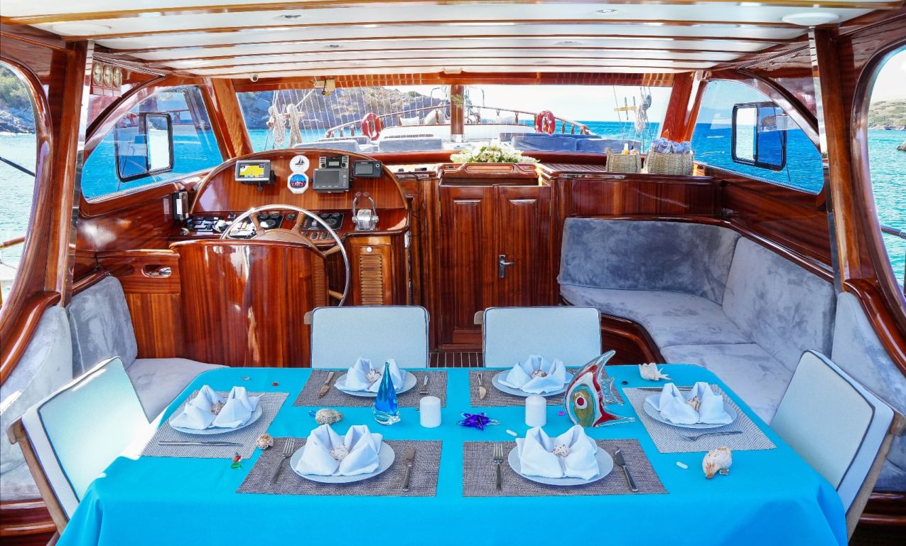 | Die Gulet Oalis ist eine 19 Meter lange traditionelle Holzyacht, gebaut 2011. Sie verfügt über eine Master- und zwei Doppelkabinen, jeweils mit eigenem Bad, und bietet Platz für bis zu sechs Gäste – perfekt für Familien oder kleine Gruppen. Das Deck wurde sorgfältig gestaltet und bietet gemütliche Sitz- und Essbereiche im Freien. Unter Deck befindet sich ein einladender Salon mit Essbereich und voll ausgestatteter Kombüse. Für Wassersport bietet Oalis ein Beiboot mit 25 PS Außenborder, ein Paddleboard, ein Kanu, Schnorchel- und Angelausrüstung. Angetrieben von zwei 280 PS Iveco-Motoren erreicht sie 9 Knoten. Ein 16 kVa Generator und 12V/24V/220V Stromversorgung sorgen für Komfort; Klimaanlage ist bis zu 5 Stunden täglich verfügbar. Die Gulet Oalis segelt entlang der Südwestküste der Türkei – ab Bodrum, Marmaris, Göcek oder Fethiye – und bringt Gäste in verborgene Buchten und türkisfarbene Gewässer. |
