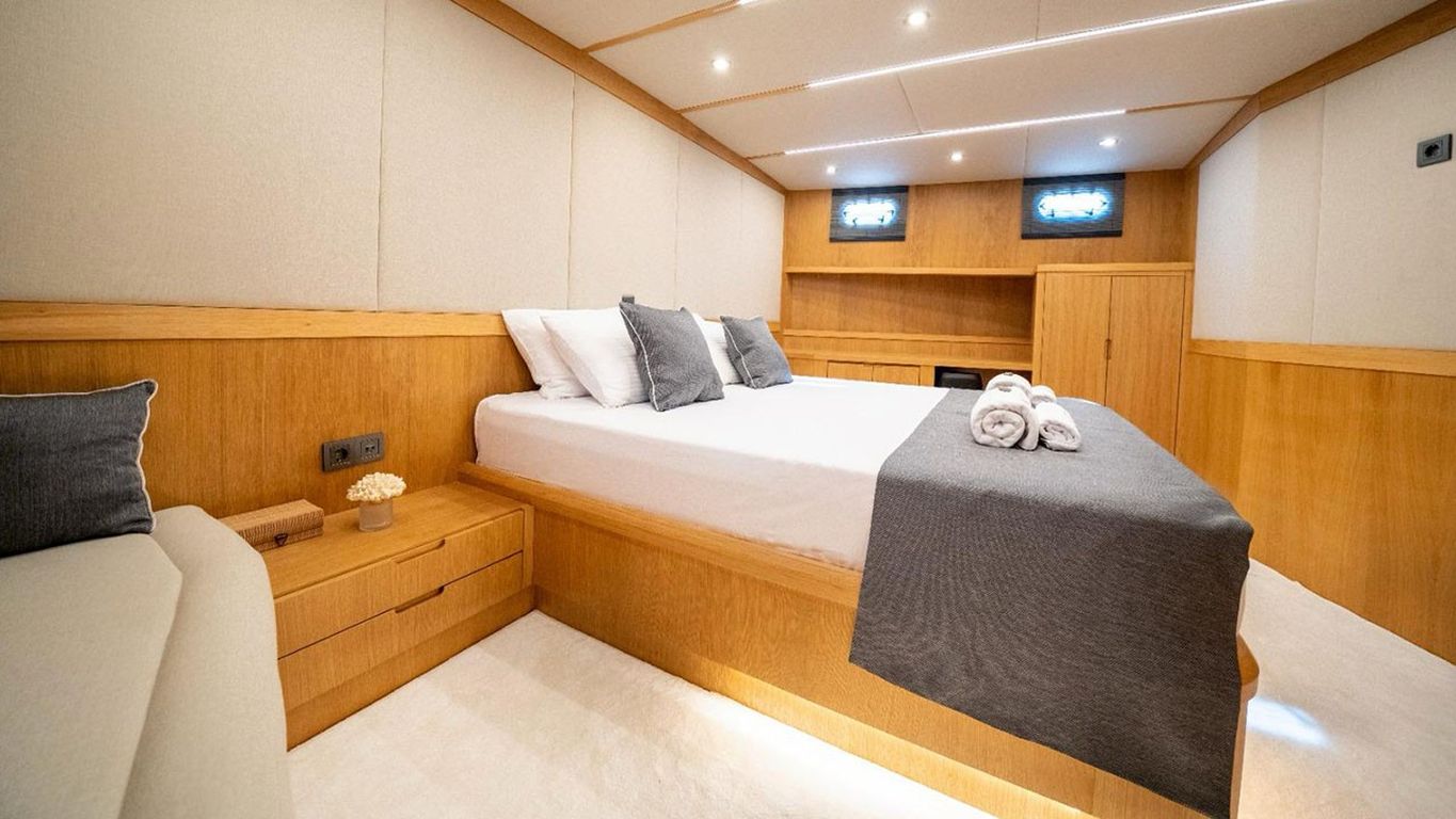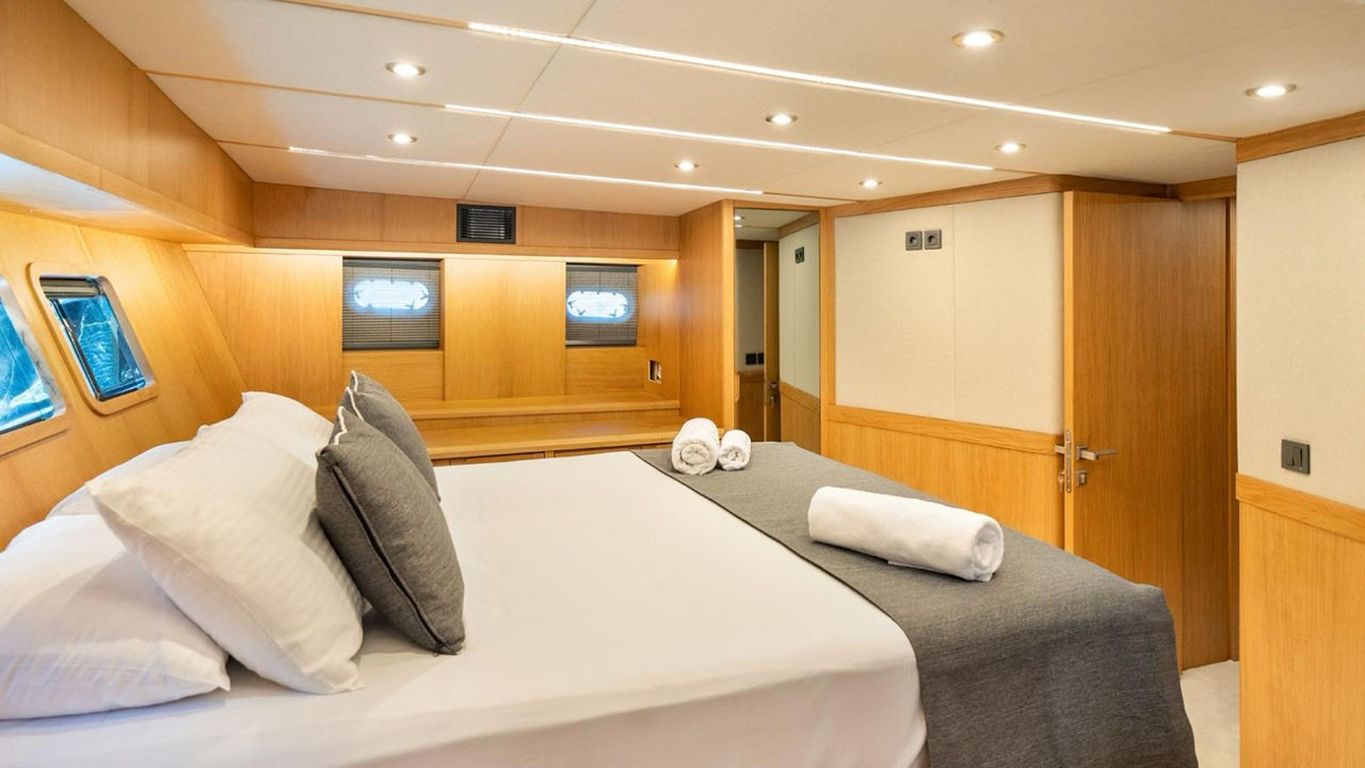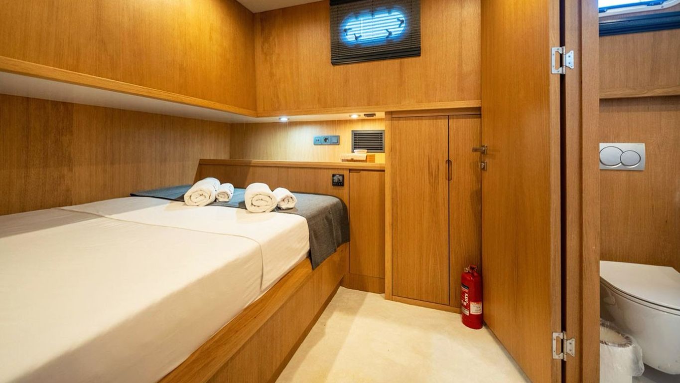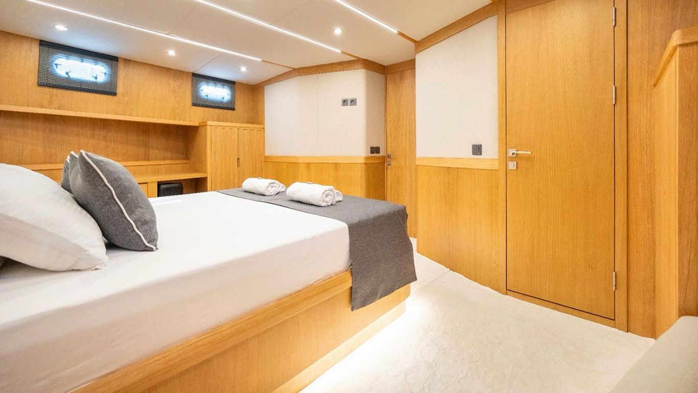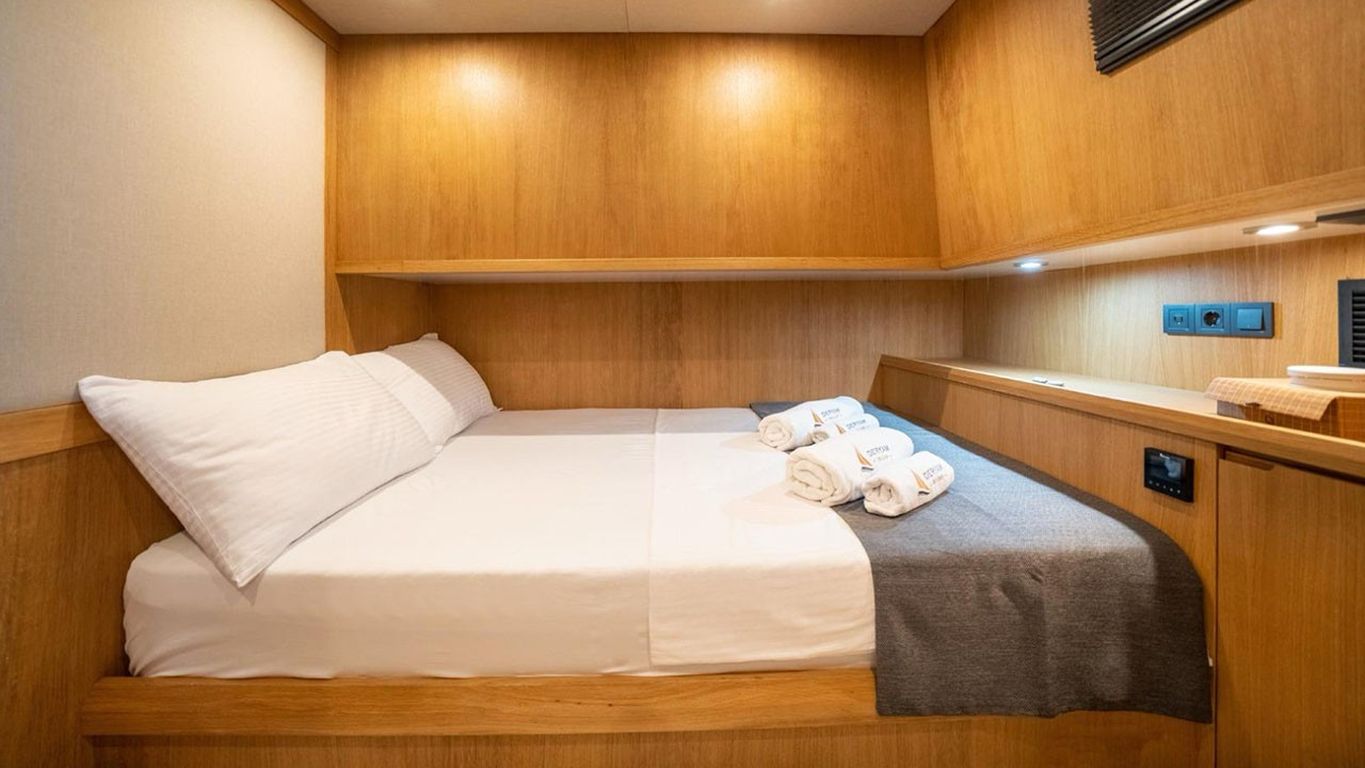 Mit fünf Kabinen – zwei Master-, einer Doppel- und zwei Zweibettkabinen – bietet sie Platz für bis zu zehn Gäste.