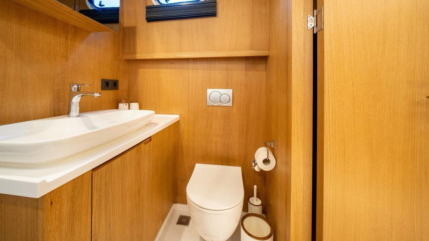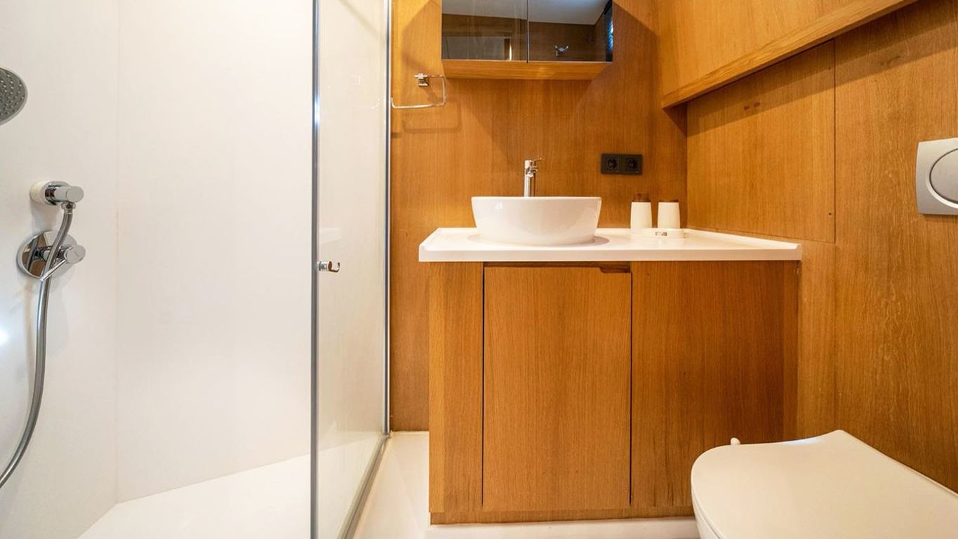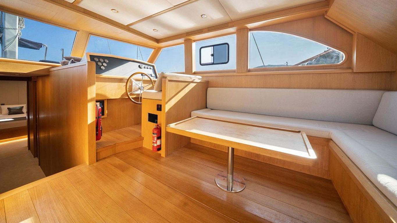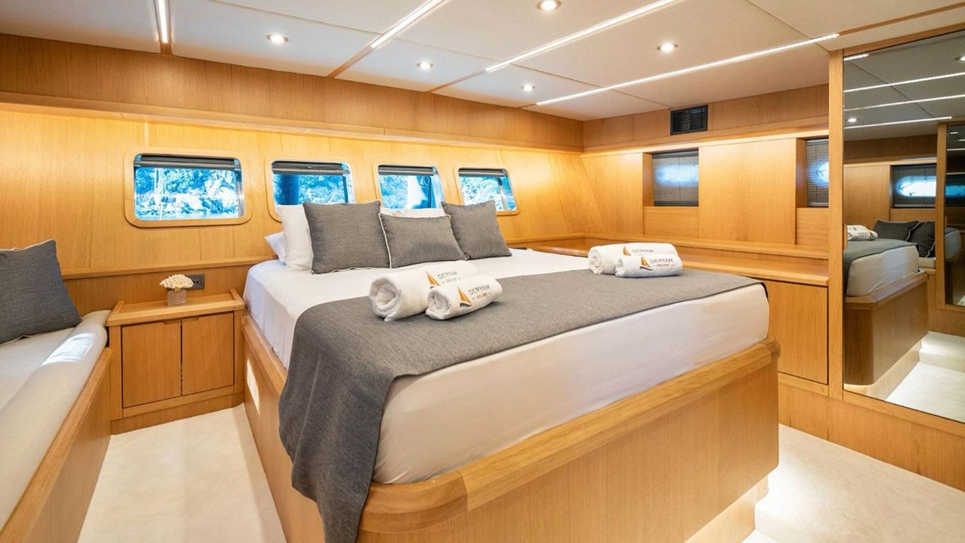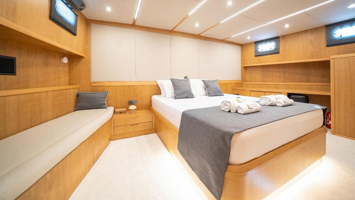 Mit fünf Kabinen – zwei Master-, einer Doppel- und zwei Zweibettkabinen – bietet sie Platz für bis zu zehn Gäste.