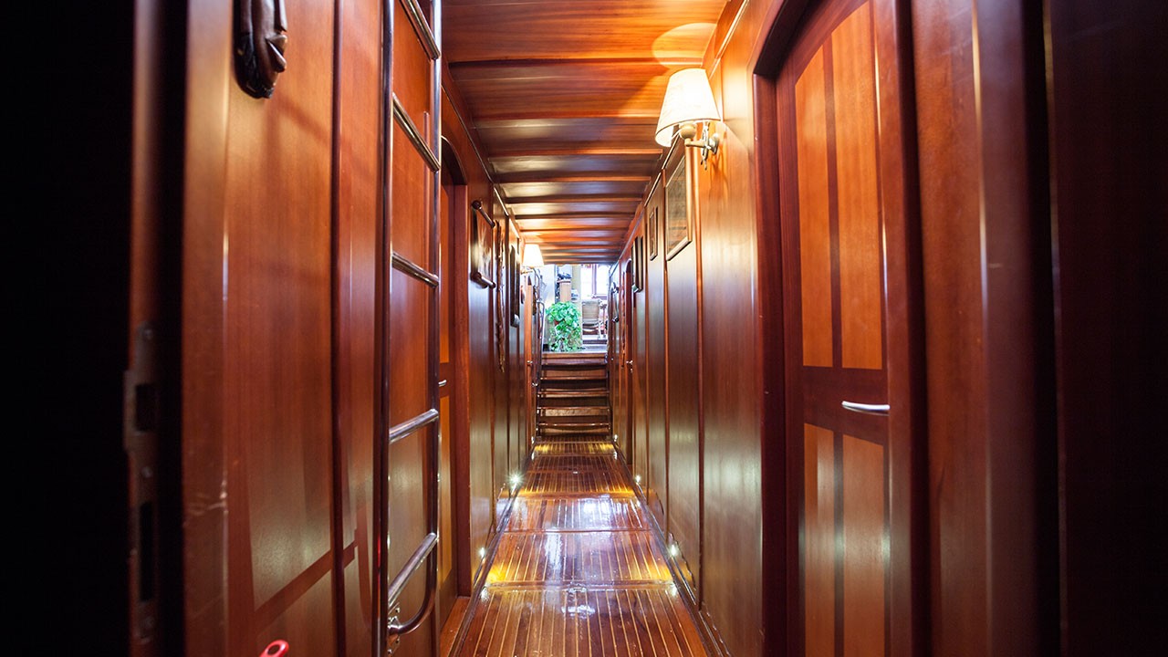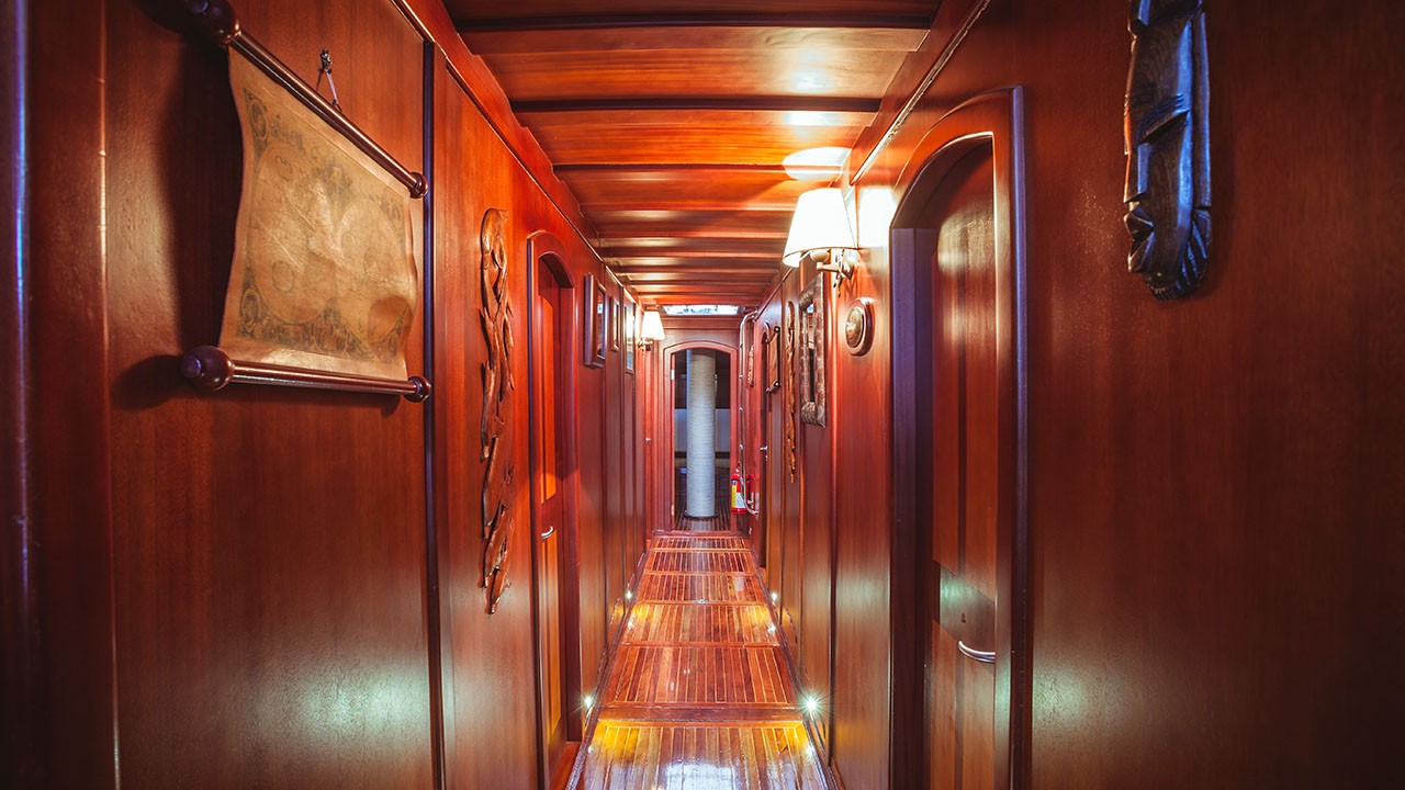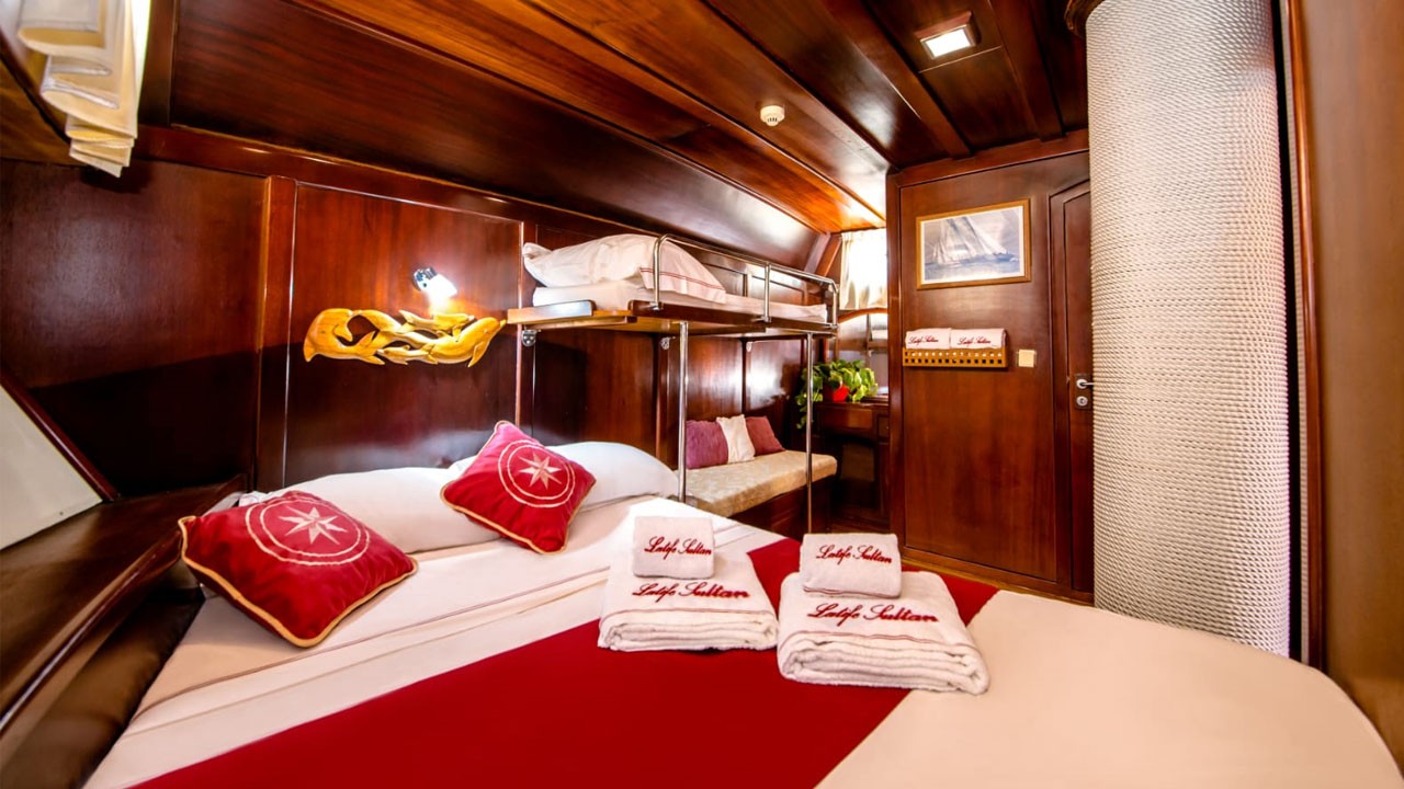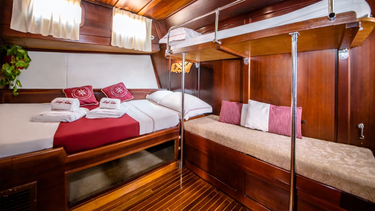 | Kapazität für bis zu 11 Gäste; 1 Masterkabine, 4 Doppelkabinen, Duschkabine und Toiletten in allen Kabinen, separate Mannschaftskabinen. |