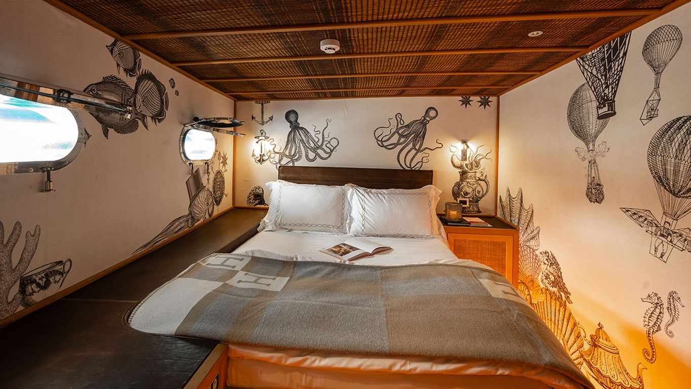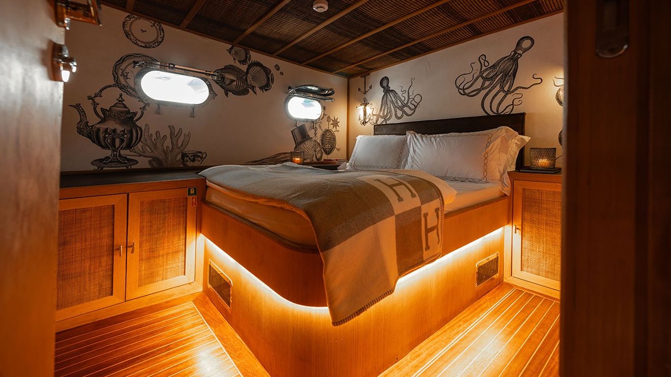 | Kapazität für bis zu 10 Gäste; 1 Masterkabine, 4 Doppelkabinen, Duschkabine und Toiletten in allen Kabinen, separate Mannschaftskabinen. |