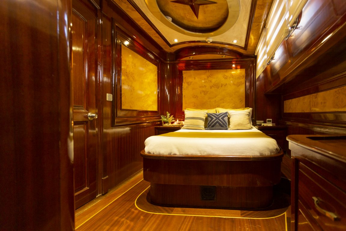 Gesamtkapazität für Gäste: 10, 1 Master-Kabinen: Queensize-Bett mit eigenem Badezimmer, Klimaanlage, Flachbildfernseher 2 Twin-Kabinen: zwei Einzelbetten mit eigenem Badezimmer, Flachbildfernseher 2 Doppelkabinen: eigenes Badezimmer, Flachbildfernseher, Einzelbetten Essbereiche: Klimatisierter Hauptsalon und sonnenüberdachtes Achterdeck Cocktailbereich: Großer Cocktailbereich mit Sitzgelegenheiten im Bugsalon. Ausstattung: Flachbildfernseher, DVD, HiFi Pioneer mit iPod-, iPhone- und Laptop-Anschlüssen. WLAN: 4G. Fernseher: Satellit (Raymarine), Apple TV. |