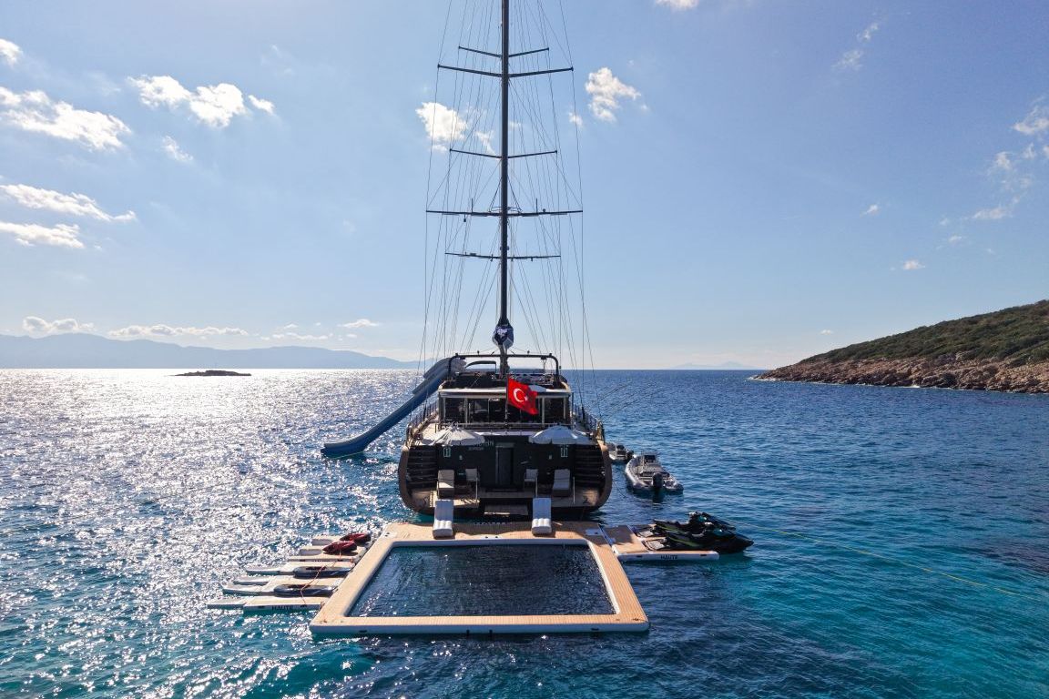 | 5,80 m langes Beiboot mit 130 PS Außenbordmotor, 4,20 m langes Serviceboot mit 60 PS Außenbordmotor, 2 Jetskis, 2 Seabobs, 2 Foilboards, 2 Stand-Up-Paddle-Boards, 2 Kanus, Schnorchel- und Tauchausrüstung, aufblasbarer Pool für den Heckbereich, aufblasbare Wasserrutsche, Smart-TV, WLAN, Bluetooth-Musikanlage, Wassermacher, voll ausgestattete Kombüse. |