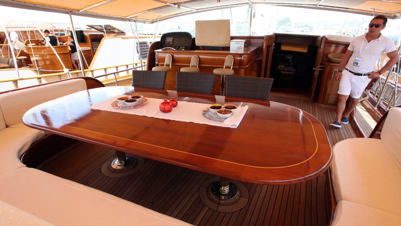 | Die Gulet Sema Tuana ist eine 32 Meter lange Luxus-Gulet, die 2008 vom Stapel lief und 2017 modernisiert wurde. Das Anwesen verfügt über sechs Kabinen, darunter zwei Master-Suiten, zwei Doppelkabinen und zwei Zweibettkabinen, und bietet Platz für bis zu 12 Gäste. Jede Kabine ist mit Klimaanlage, eigenem Bad und elegantem Dekor ausgestattet. Das Deck bietet einen großzügigen Essbereich im Freien, bequeme Liegen und viel Platz zum Sonnenbaden. Der Salon ist geschmackvoll eingerichtet und mit modernen Annehmlichkeiten ausgestattet. Für Wassersportaktivitäten stehen ein 70 PS starkes Beiboot, ein Jetski, Wasserski, Wakeboard, Kanu, Schnorchelausrüstung und Angelausrüstung zur Verfügung. Die Details zum Treffen finden Sie unten. Das Schiff wird von zwei 370 PS starken Scania-Motoren angetrieben, die jeweils einen 22,5 kVA-Generator antreiben und eine Reisegeschwindigkeit von 10 Knoten ermöglichen. Eine Klimaanlage ist rund um die Uhr verfügbar. Die Gulet Sema Tuana ist die perfekte Wahl für alle, die Luxus, Stil und Abenteuer auf dem türkisfarbenen Wasser der Türkei suchen. |