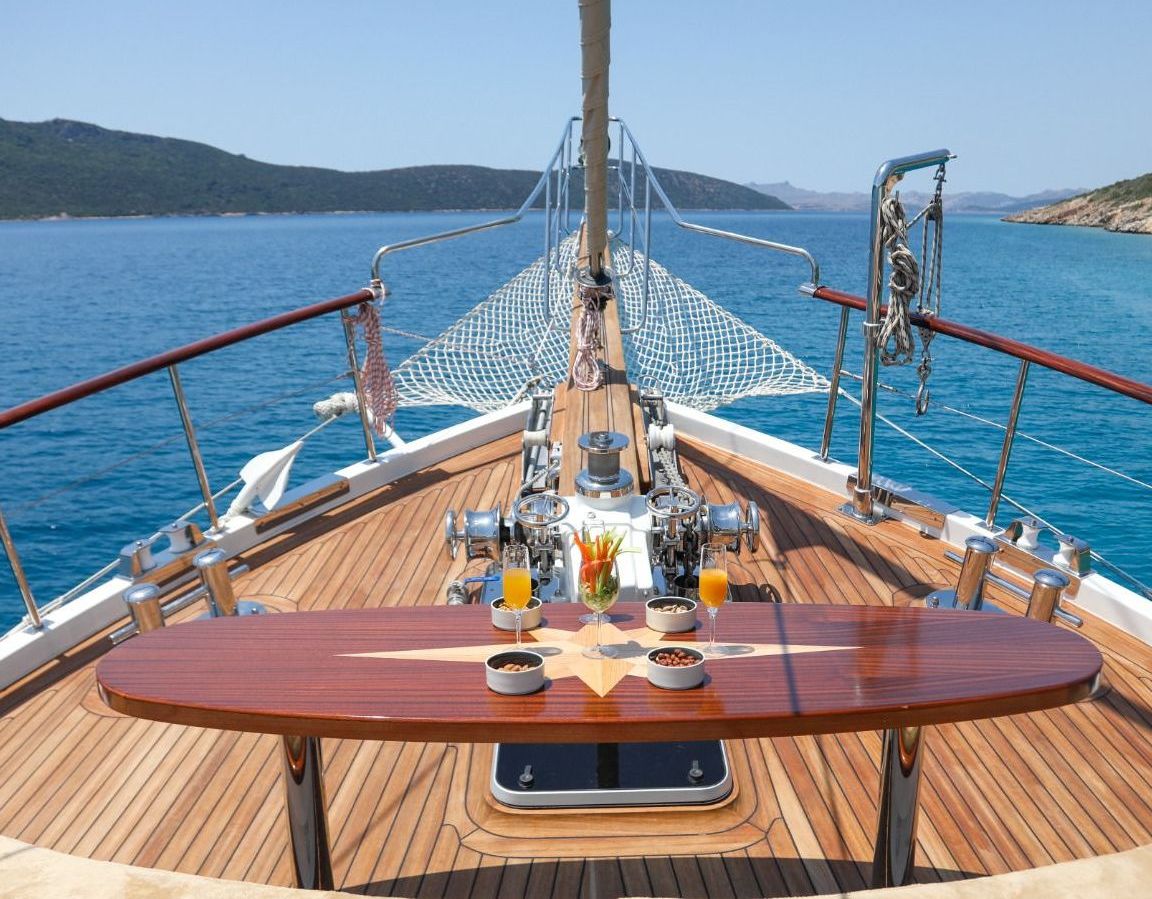 Es gibt Kanus, Schnorchel, Masken, Flossen und einfache Angelausrüstung, um die Zeit auf See angenehmer zu gestalten, und um die Zeit auf dem Deck unterhaltsamer zu gestalten, gibt es ein Rommé-Set, Backgammon, Spielkarten, einen DVD-Player, ein Musiksystem und eine Klimaanlage. Unser erfahrenes Personal auf dem Boot steht Ihnen bei der Zubereitung von Speisen, dem Service, der täglichen Reinigung und allen Angelegenheiten, die Sie während der Blauen Reise benötigen, zur Verfügung. Der Kapitän und die Besatzung, die über Segelerfahrung verfügen, werden segeln, wenn das Wetter es zulässt, und Sie können das Vergnügen einer Segel-Blauen-Kreuzfahrt in der Ägäis erleben. Um eine preiswerte und angenehme Blaue Tour in türkischen Hoheitsgewässern zu erleben, laden wir Sie zu einer Blauen Reise mit unserer Ulucinar-Gulet ein.